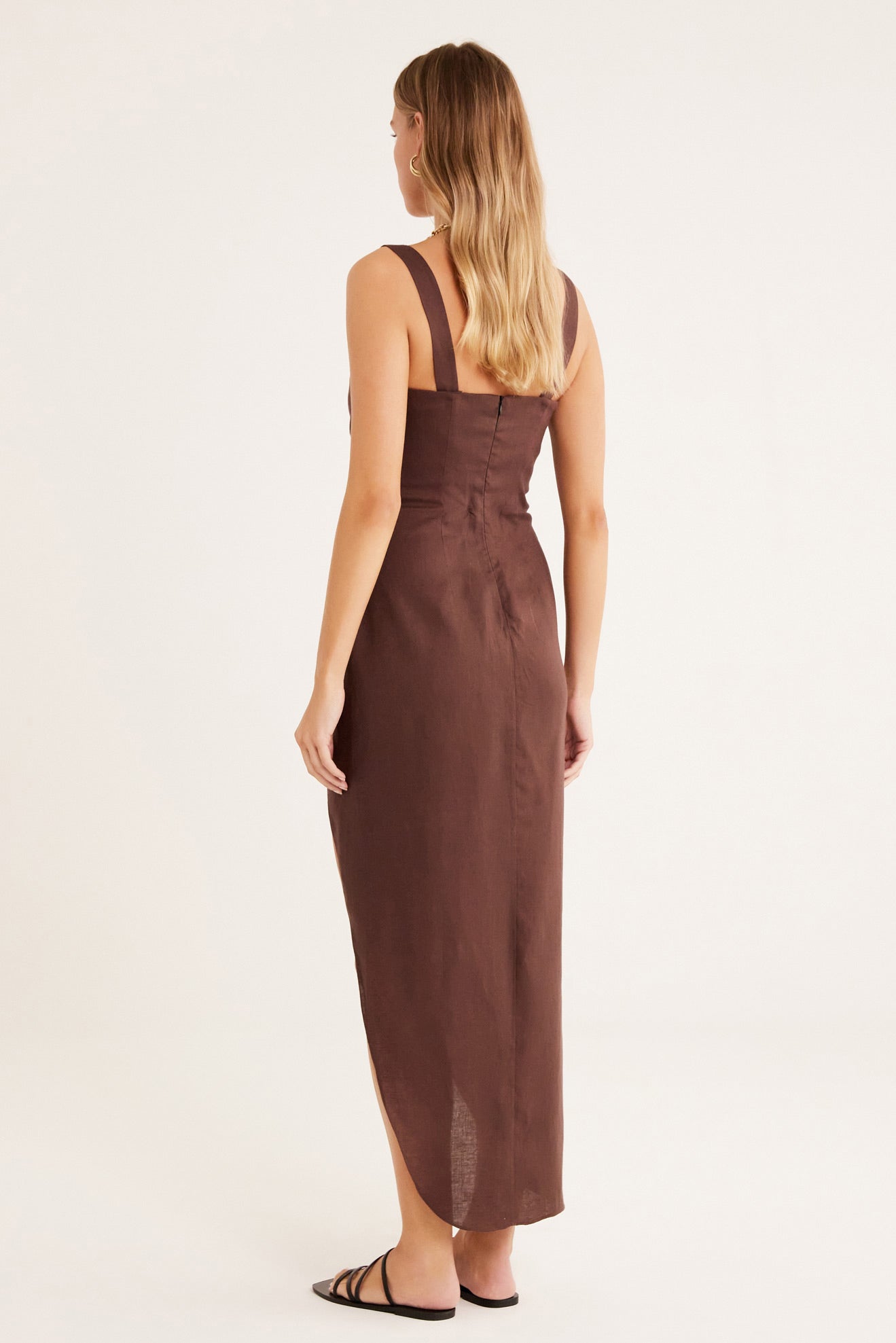 Plunge front maxi dress with an ultra fine covered underwire, tucks at front hip and cut away hem. Bodice is lined.