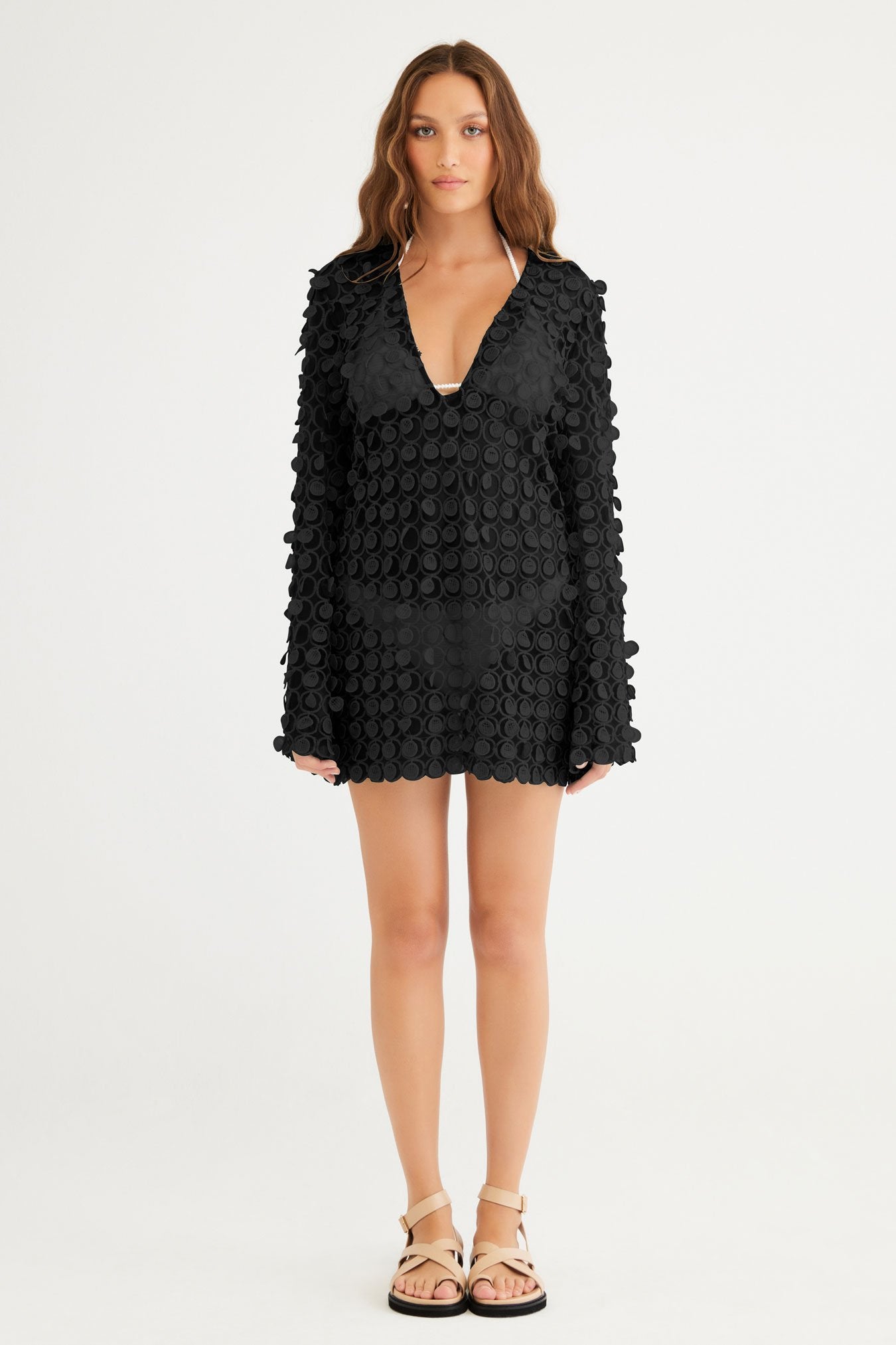 Channel coastal charm in this floaty long sleeve mini. Crafted from a sheer textured fabrication, she features a deep v neckline & exaggerated bell sleeve. Not lined.