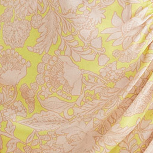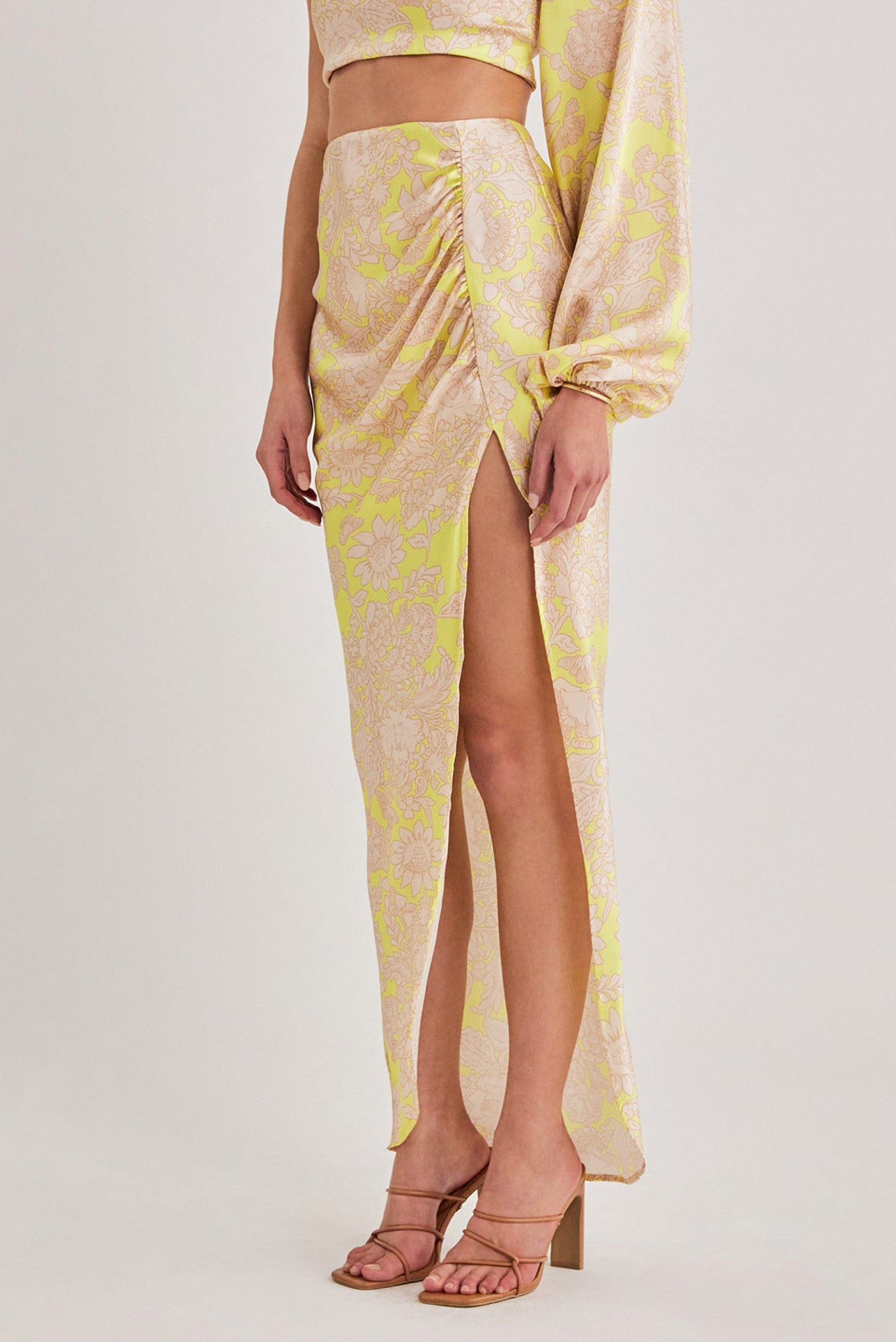 High waisted skirt with flattering side gathers & cut away hem. Crafted from stunning floral satin.